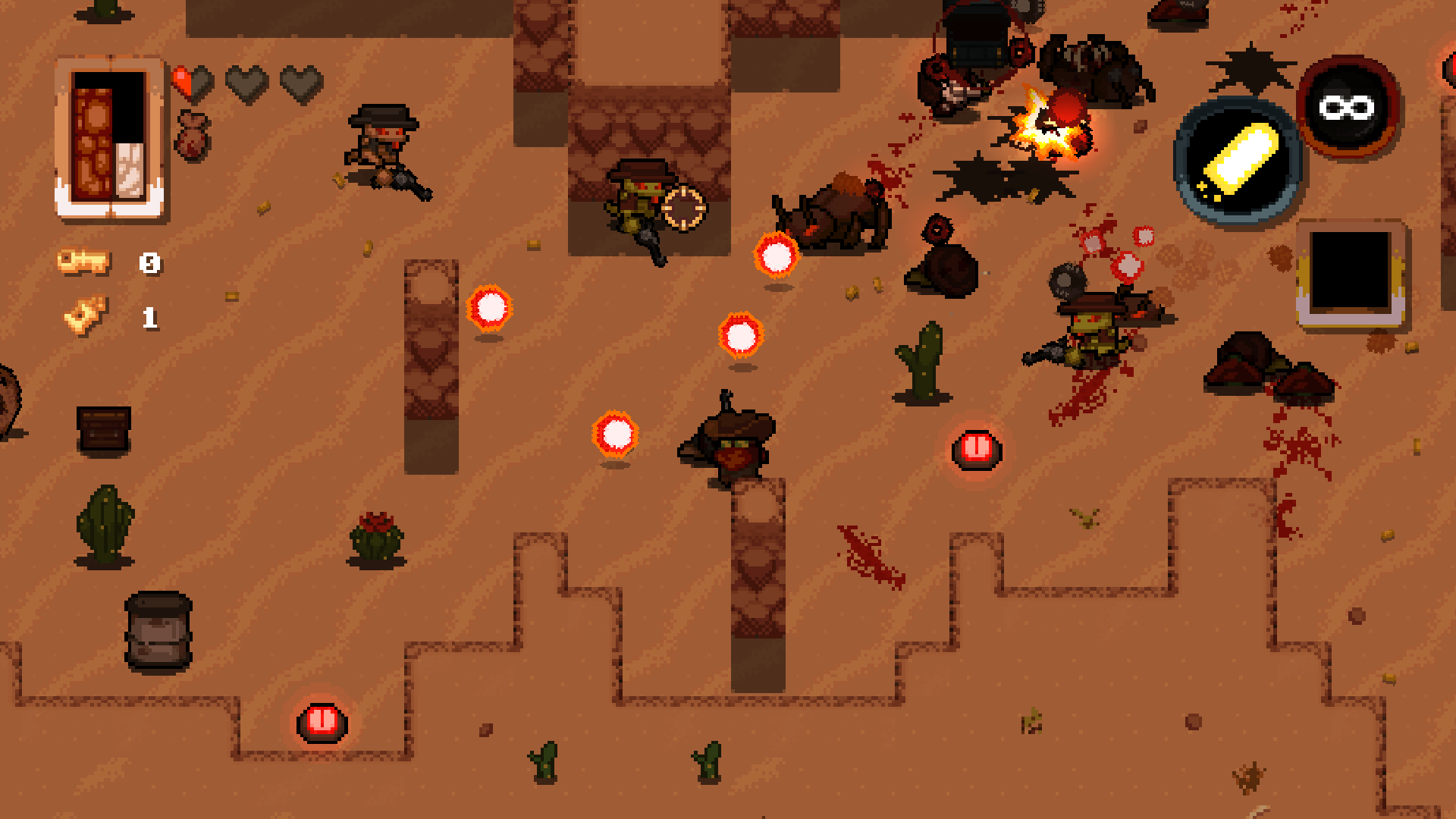 1. GAMEPLAY its a roguelike that reminds me of isaac, but its still trying to be its own thing does it succeed in it? yes the gameplay feels snappy and fast (which i really like), and the enemies are not that easy to deal with, so the game isnt just "press shoot to shoot EVERYONE and KILL and DESTROY" i like the variety of weapons (even if there's not really a lot of them) and buffs you can get for them